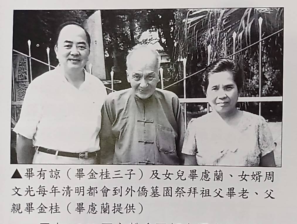 畢家三代協助福傳 1884畢金桂(1858-1926)繼承父業,1903將其店家(今中正路165號)借給西籍林茂才神父作為傳道所,1906並幫助天主教會購買崎仔頂6間房地,作為教堂、神父樓、道理廳及社宅(供無殼蝸牛居住),天主教會才開始立足淡水市街。1826畢金桂過世,也墓葬於外僑墓園。2013淡水鎮志,畢老父子與馬偕同列於「人物誌」外人章。 1955年畢氏家族歸化為臺灣國籍,唯第三代畢有諒(1903-1990)的長相,尚見洋人臉龐(如圖中)。他晚年退休後,住到天主堂服務教會,終其一生。現有聖堂的樹木多由其手植,「福佑幼稚園」的孩童也都記得這位「畢阿公」。