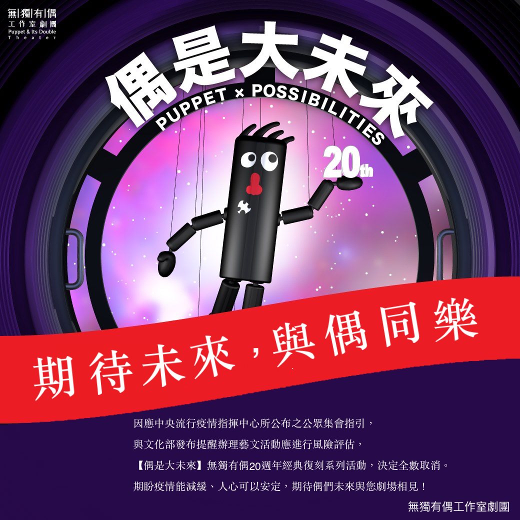 無獨有偶工作室劇團原訂2020 年6月於淡水雲門劇場舉辦20 週年展演活動,因應中央流行疫情指揮中心所公布之公眾集會指引,與文化部發布提醒辦理藝文活動應進行風險評估,《偶是大 未來》無獨有偶20 週年經典復刻系列活動,決定全數取消。期盼疫情減緩、人心安定,期待未來劇場再會!(文/無獨有偶工作室劇團)